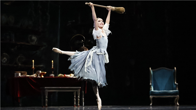 第一幕 灰姑娘的继母、父亲和继姐妹正忙着筹备宫廷舞会。灰姑娘则被支使去打扫房间。她拿起扫帚,开始扫地,然后拿出妈妈生前的画像暗自神伤。灰姑娘的父亲回来后,看到这样的场景不禁懊悔不已。灰姑娘反过来安慰着父亲。这时姐姐们闯了进来,打断了父女二人的温馨时刻,夺走了妈妈的画像。 突然一位乞讨的老巫婆走了进来。继母轻蔑地把灰姑娘妈妈的画像给了老巫婆,但是老巫婆又把画像还给了灰姑娘。灰姑娘送给了老巫婆一些面包,之后送她离开了。裁缝、假发师和舞蹈老师来到家里,帮姐姐们准备宫廷舞会。继母带着姐姐们离开,唯独将灰姑娘留在家中。她假装扫把是自己舞会上的舞伴,想要掩饰自己的孤独,却还是没忍住哭了起来。这时,乞讨的老巫婆又出现了,而且神奇地变成了仙女教母!仙女教母用魔法把厨房变成了一片森林,蜻蜓在树林间飞舞。 仙女教母给了灰姑娘一双玻璃舞鞋。春、夏、秋、冬四位仙女围着灰姑娘跳起舞来,四季随着她们的舞蹈而变换,灰姑娘的一身旧衣服也变成了一件美丽的礼服。仙女教母叮嘱她,在午夜时分,一切魔法就会消失。之后,仙女教母神奇地把一个南瓜和四只蜥蜴变成了华丽的马车和骏马,载着灰姑娘去参加舞会。